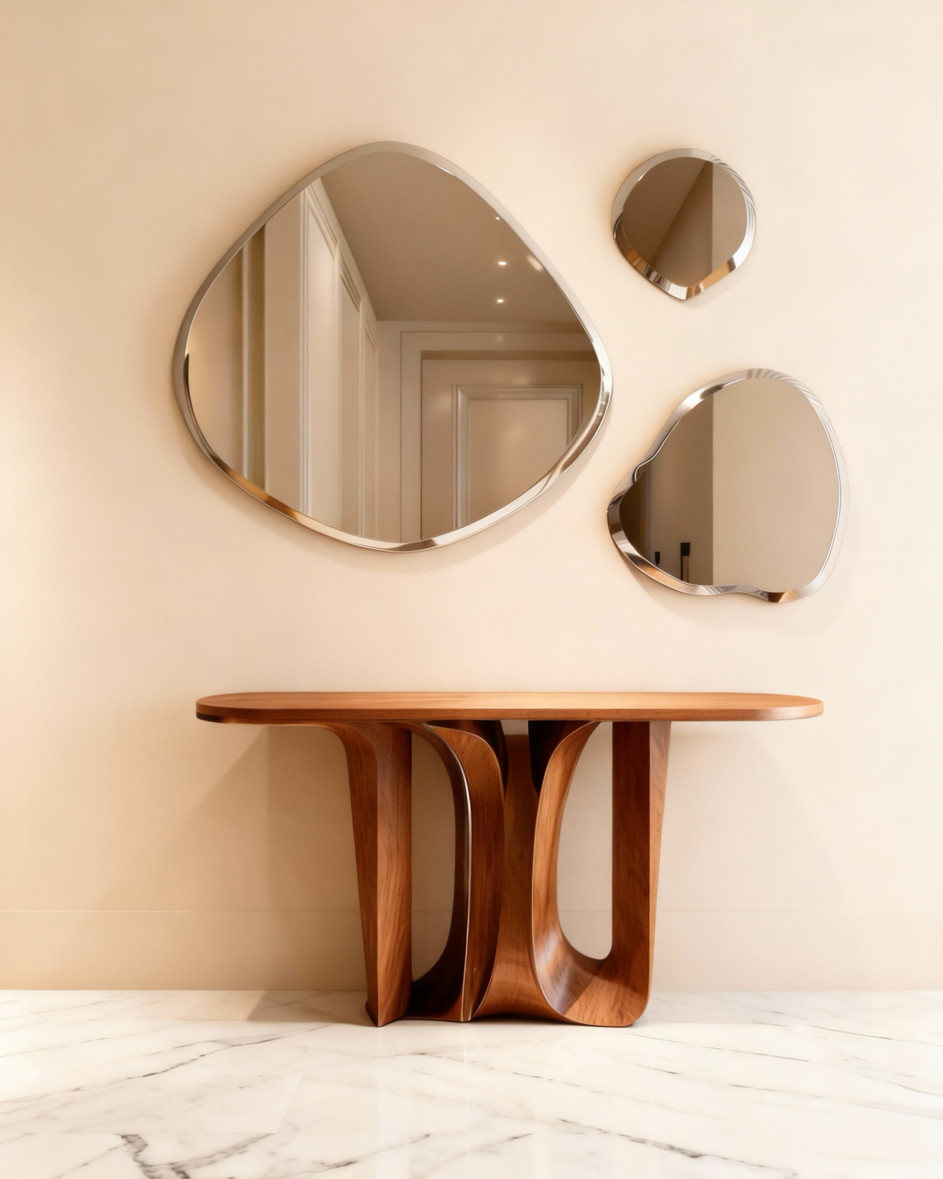 Set de 3 espejos de color plata | Los espejos no tienen marco | Tienen biselado de 3cm – 4cm en todo su contorno | Cuenta con soporte trasero diseñado para fijación segura en pared, garantizando estabilidad y protección para los habitantes del espacio | Manual de instalación y kit completo de accesorios incluidos en su caja segura de envío.