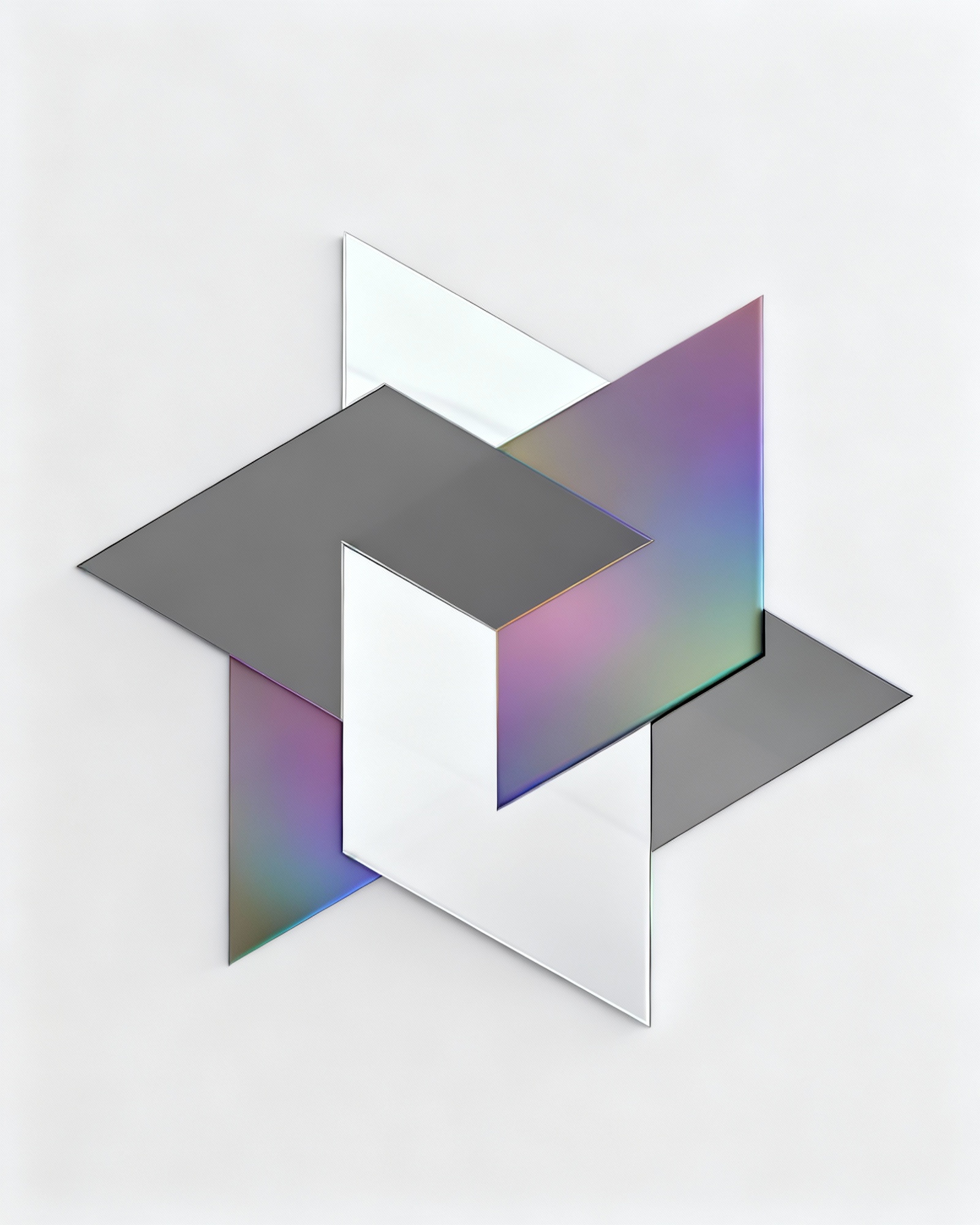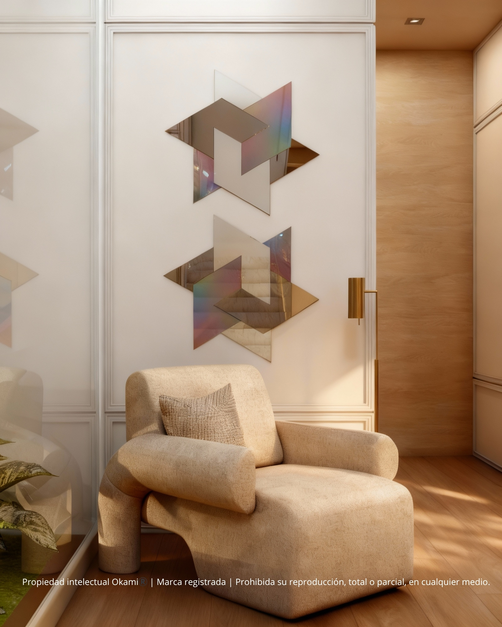 Estrella Buena corresponde a una escultura mural tridimensional en forma estelar, compuesta por módulos geométricos ensamblados con precisión milimétrica que conforman una figura hexagonal de gran pureza visual. Su diseño combina la simetría matemática con la capacidad escultórica del espejo, generando un efecto de profundidad y ligereza.