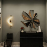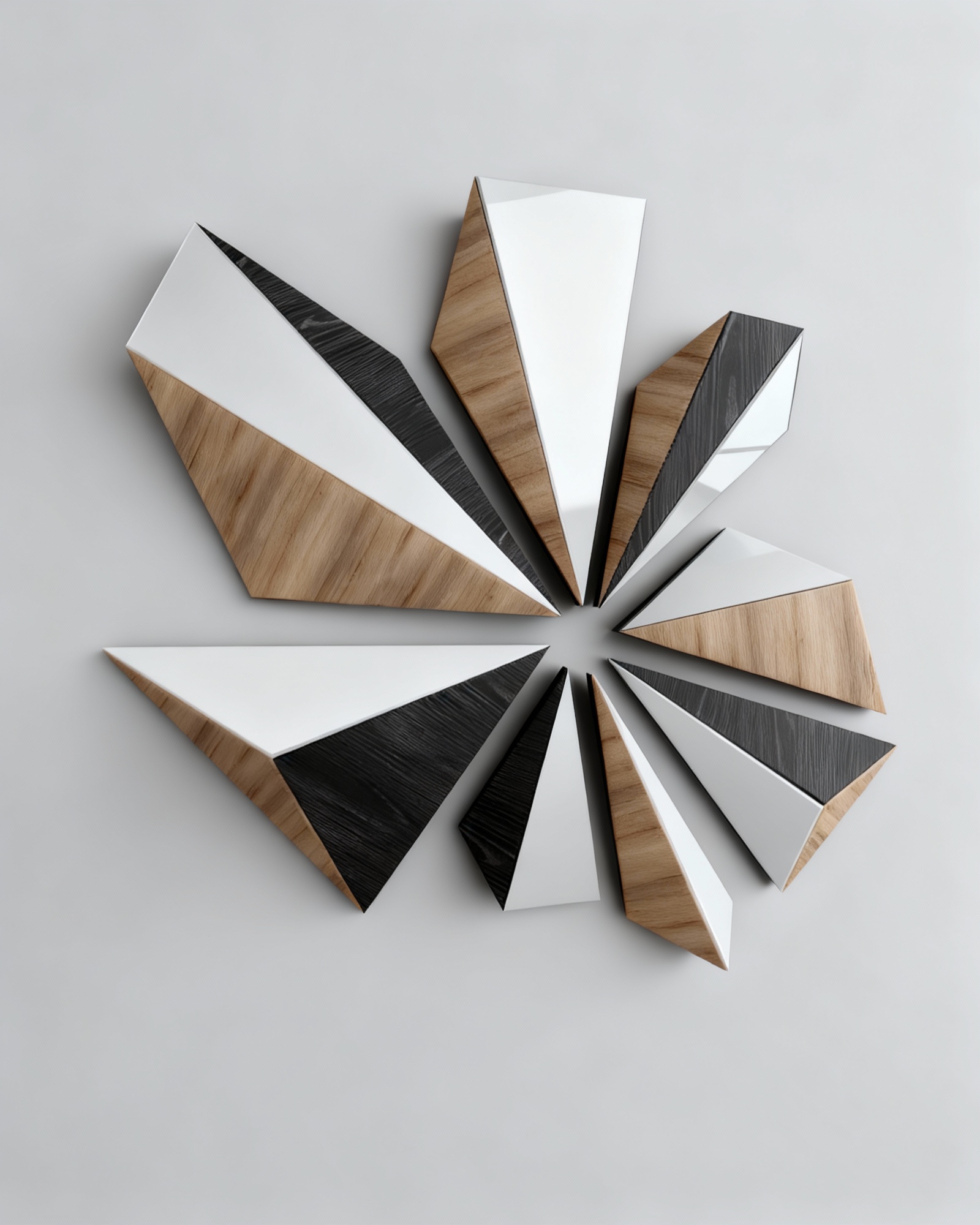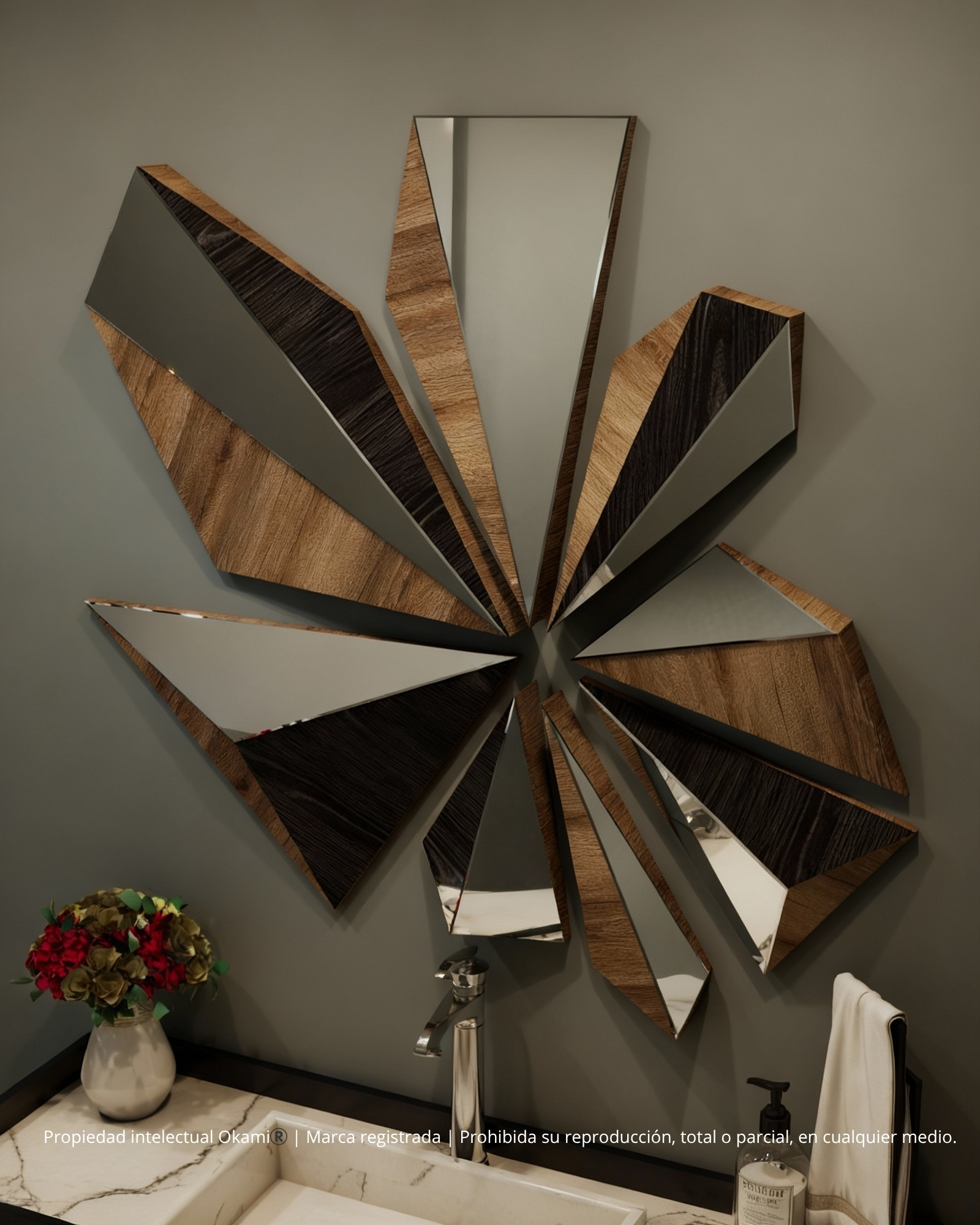 En el diseño de Sol Fractal buscamos capturar la energía inagotable del astro que da vida a todo. Imaginamos cómo la luz se fragmenta en múltiples planos, reflejando su fuerza en destellos infinitos. Cada pieza nace como un rayo contenido en geometría, ordenado y preciso, pero al mismo tiempo vibrante y cambiante. Así, el sol se transforma en una escultura: una constelación de reflejos que habita en los muros y despierta la memoria de nuestra conexión con la luz.