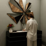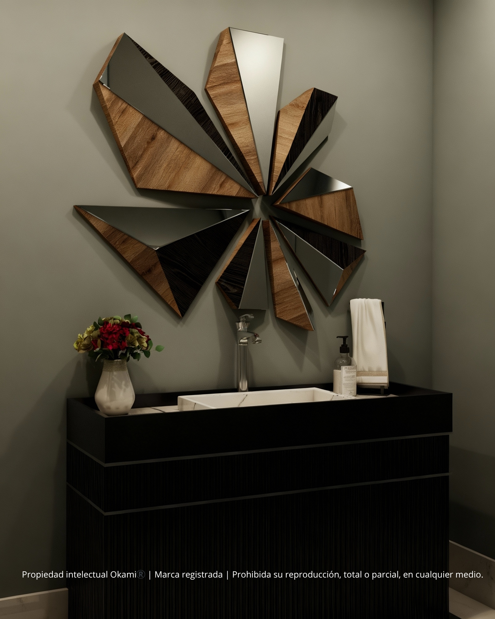 Cada módulo se fabrica a partir de una combinación de materiales nobles y puros: Paneles de madera enchapado en tono ébano satinado, que aportan profundidad y contraste a la composición. El juego entre planos espejados y superficies oscuras resalta la geometría facetada, creando destellos que cambian según la perspectiva y la iluminación del espacio.