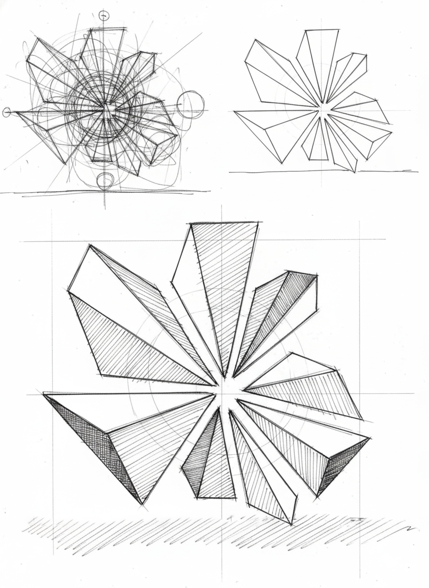 En el diseño de Sol Fractal buscamos capturar la energía inagotable del astro que da vida a todo. Imaginamos cómo la luz se fragmenta en múltiples planos, reflejando su fuerza en destellos infinitos. Cada pieza, construida a partir de una forma geométrica que se repite en todos los diseños de la colección, nace como un rayo contenido en geometría, ordenado y preciso, pero al mismo tiempo vibrante y cambiante. Así, el sol se transforma en una escultura: una constelación de reflejos que habita en los muros y despierta la memoria de nuestra conexión con la luz, irradiando su propia luz interna.