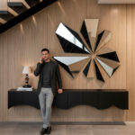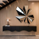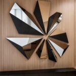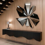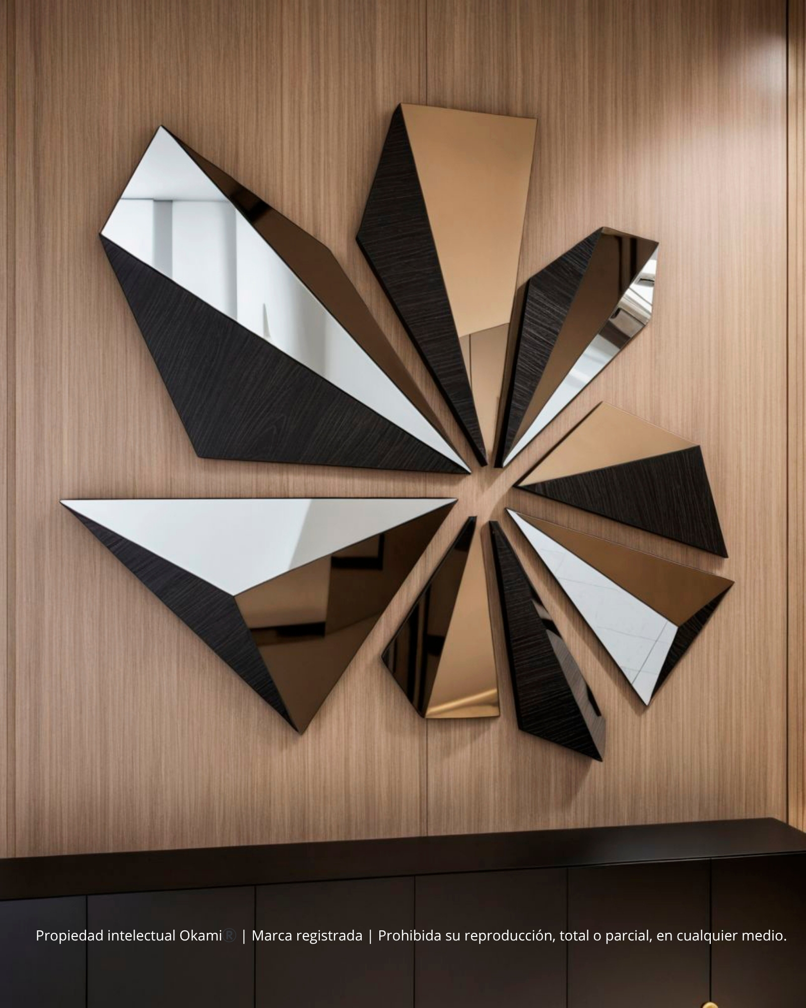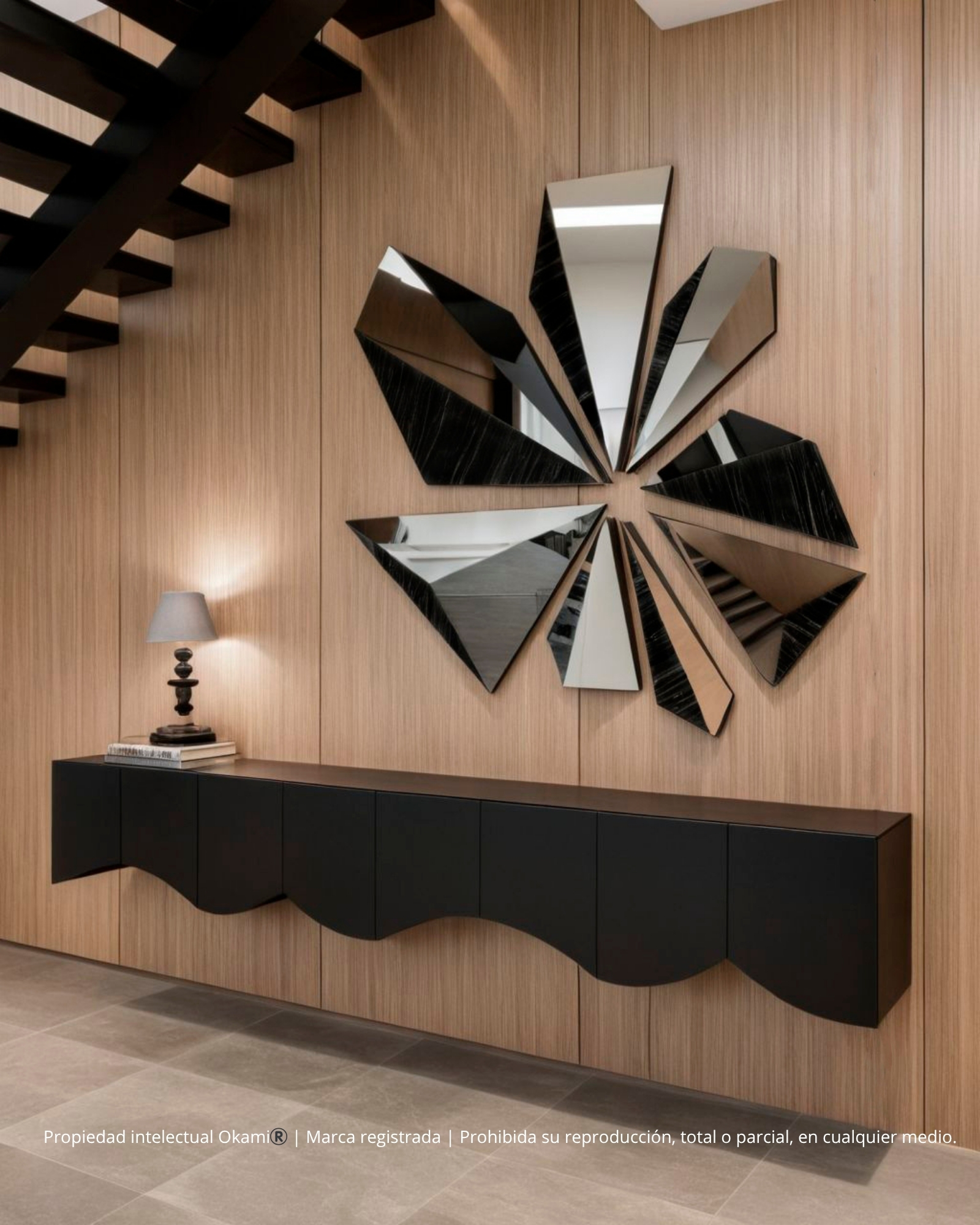 Cada módulo se fabrica a partir de una combinación de materiales nobles y puros: Paneles de madera maciza enchapado en tono ébano, que aportan profundidad y contraste a la composición. El juego entre planos espejados y superficies oscuras resalta la geometría facetada, creando destellos que cambian según la perspectiva y la iluminación del espacio.